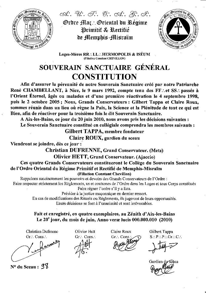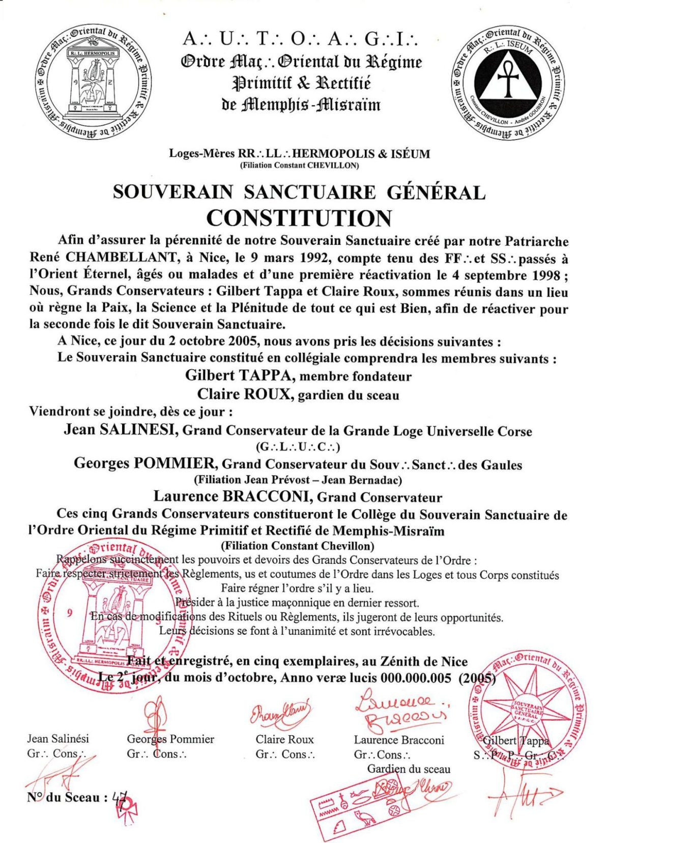 In 2005, after the departure of T:. Ill:. F:. Smprr PRR:. for the Eternal Orient, Gilbert TAPPA, successor to T:. Ill:. F:. René Chambellant, assisted by T:. Ill:. S:. Claire ROUX, welcomed two new brothers and a sister to the Sovereign Sanctuary.
